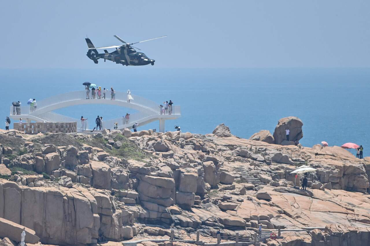 Chinese military helicopters fly past Pingtan island, one of mainland China's closest point from Taiwan, on Aug 4, 2022.