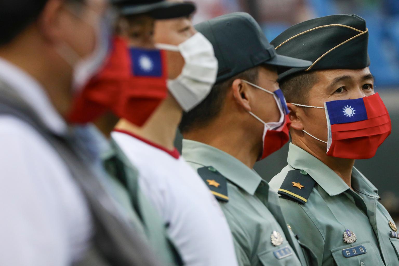 Army representatives are seen at the opening of a baseball game in Taiwan on May 7, 2020.