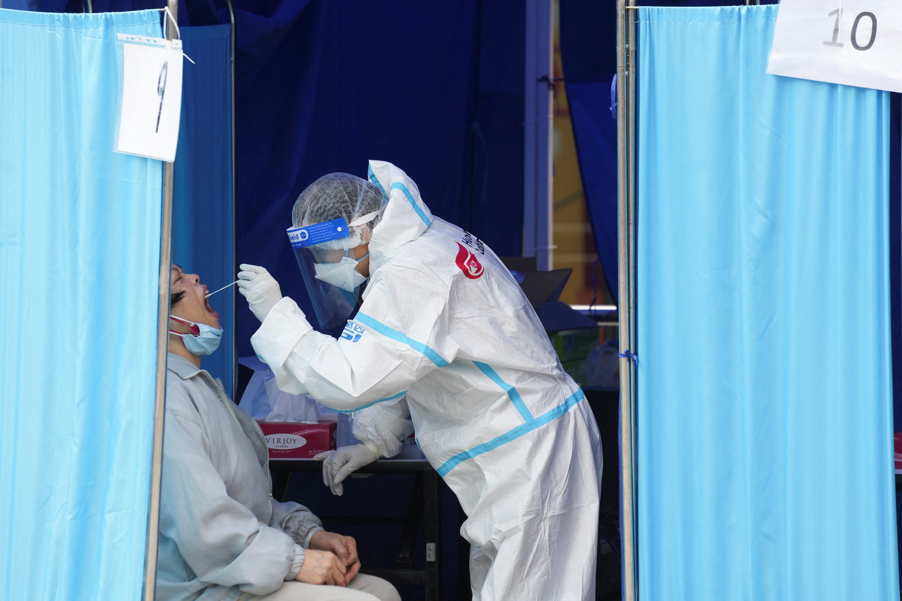 A medical worker takes a swab sample from a woman in Hong Kong on Feb 18, 2022.