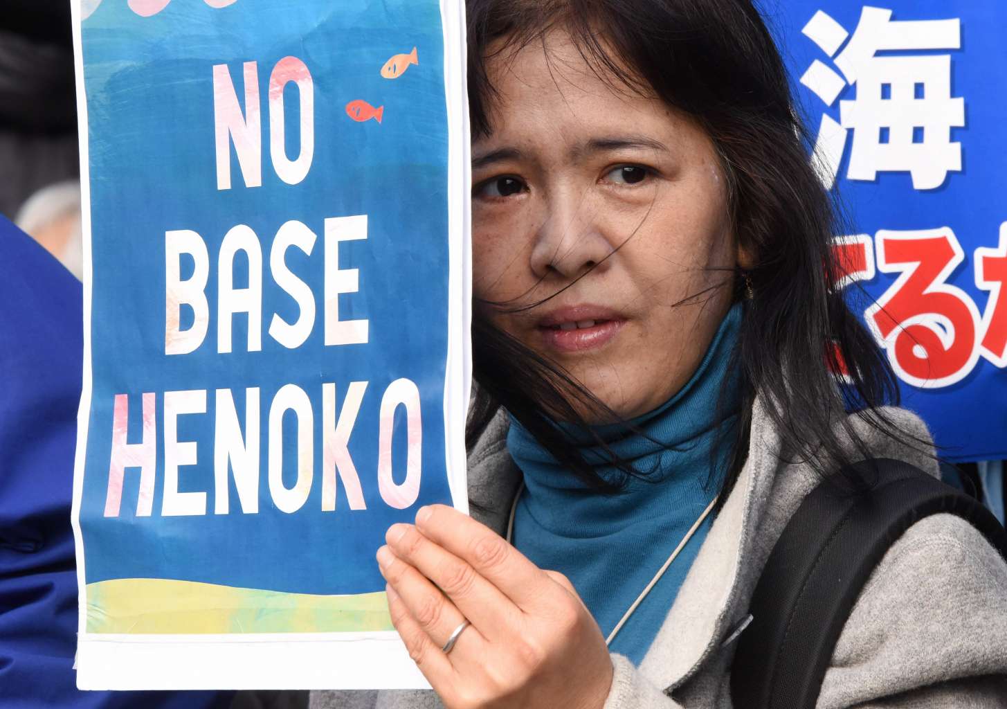 A woman holding a banner against the building of a US military base in Henoko in Japan's Okinawa prefecture, during a protest in Tokyo on Feb 21, 2016.