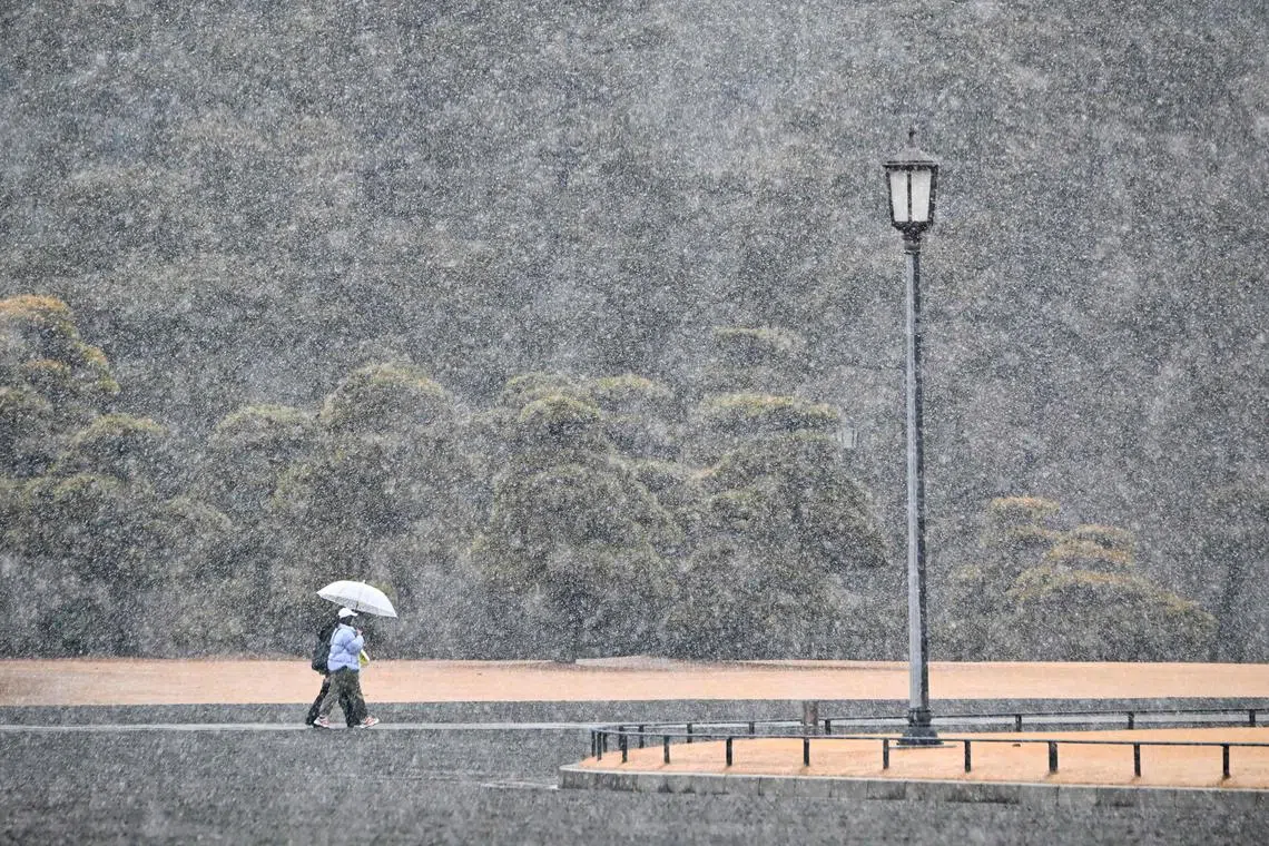 Pedestrians walk at a park in front of the Imperial Palace amid snowfall in Tokyo on Feb 5.