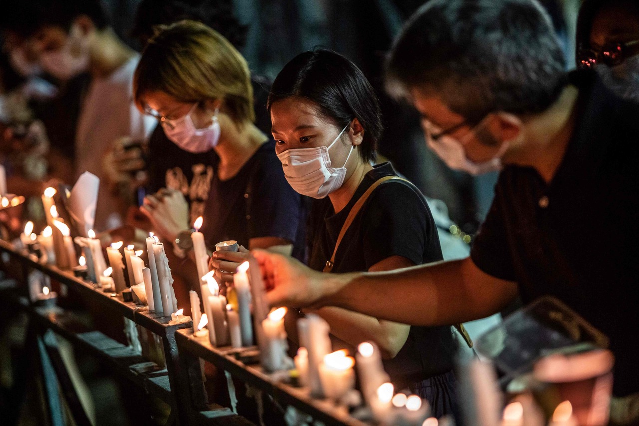 A file photo taken on June 4, 2020, shows people lighting candles during a remembrance to mark the Tiananmen Square crackdown, at Hong Kong's Victoria Park.