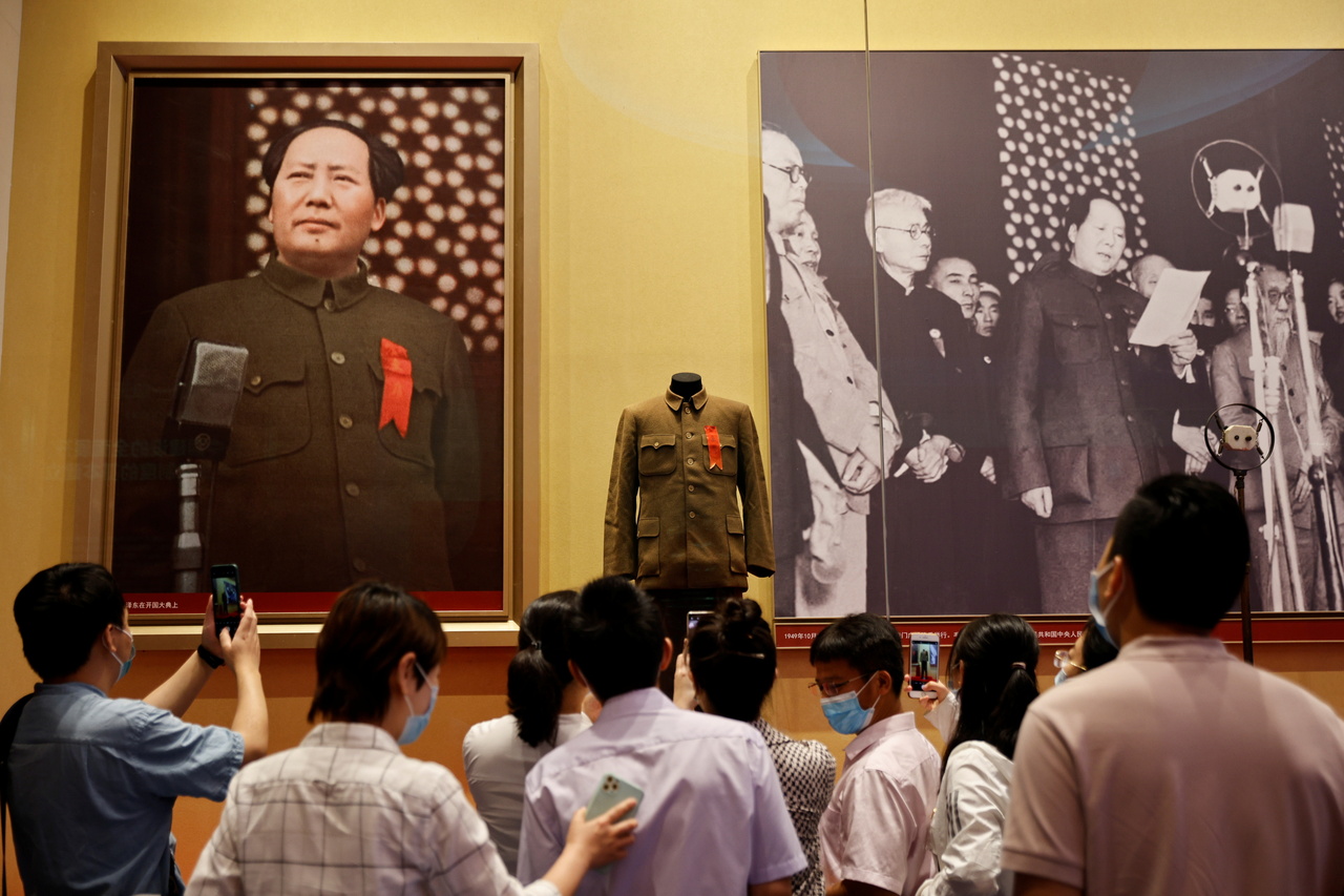 People looking at images of Mao Zedong at the Museum of the Communist Party of China in Beijing, on June 25, 2021.