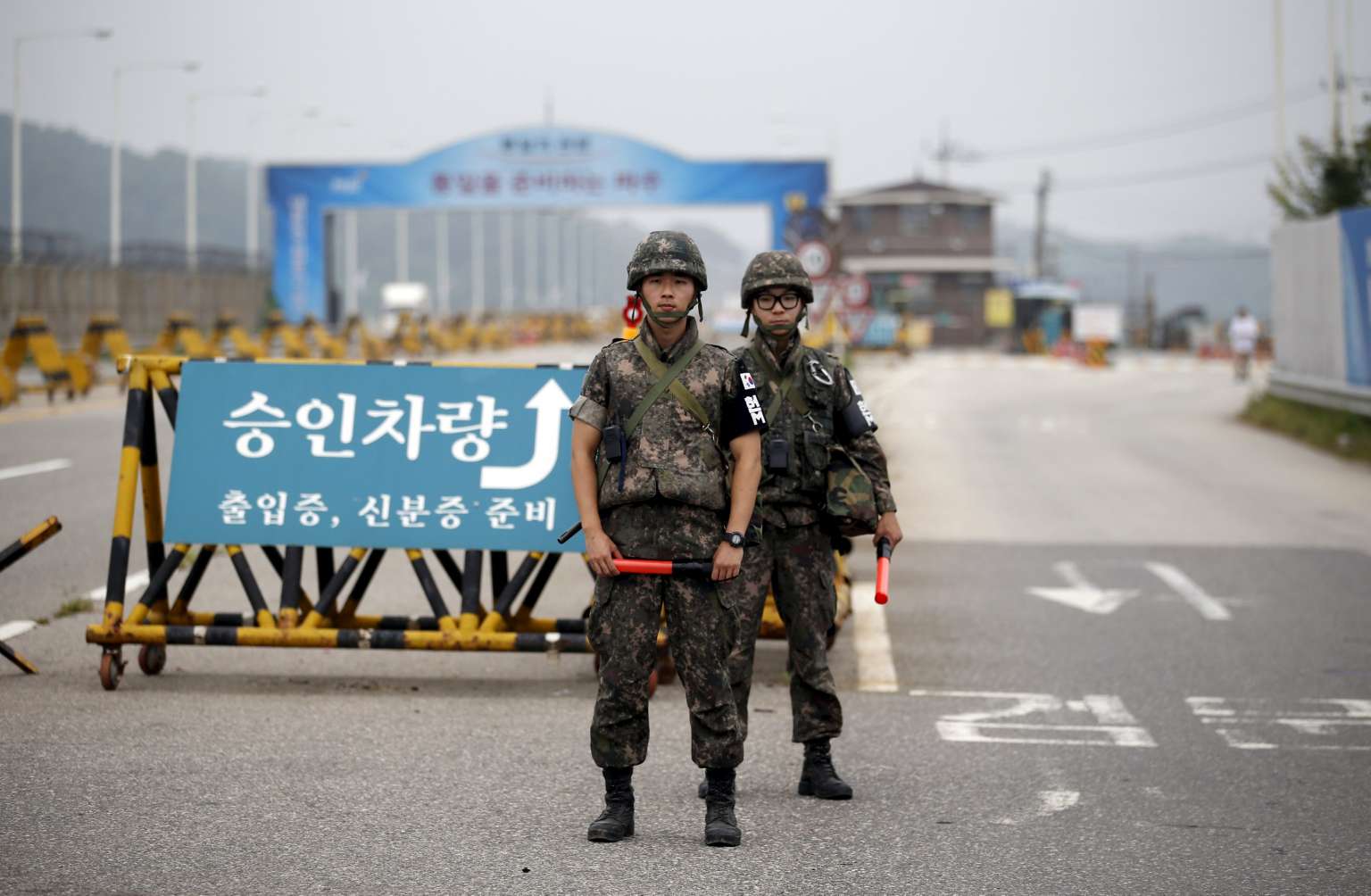 South Korean soldiers stand guard at a checkpoint on the Grand Unification Bridge just south of the demilitarised zone separating the two Koreas, in Paju, South Korea on Aug 21.