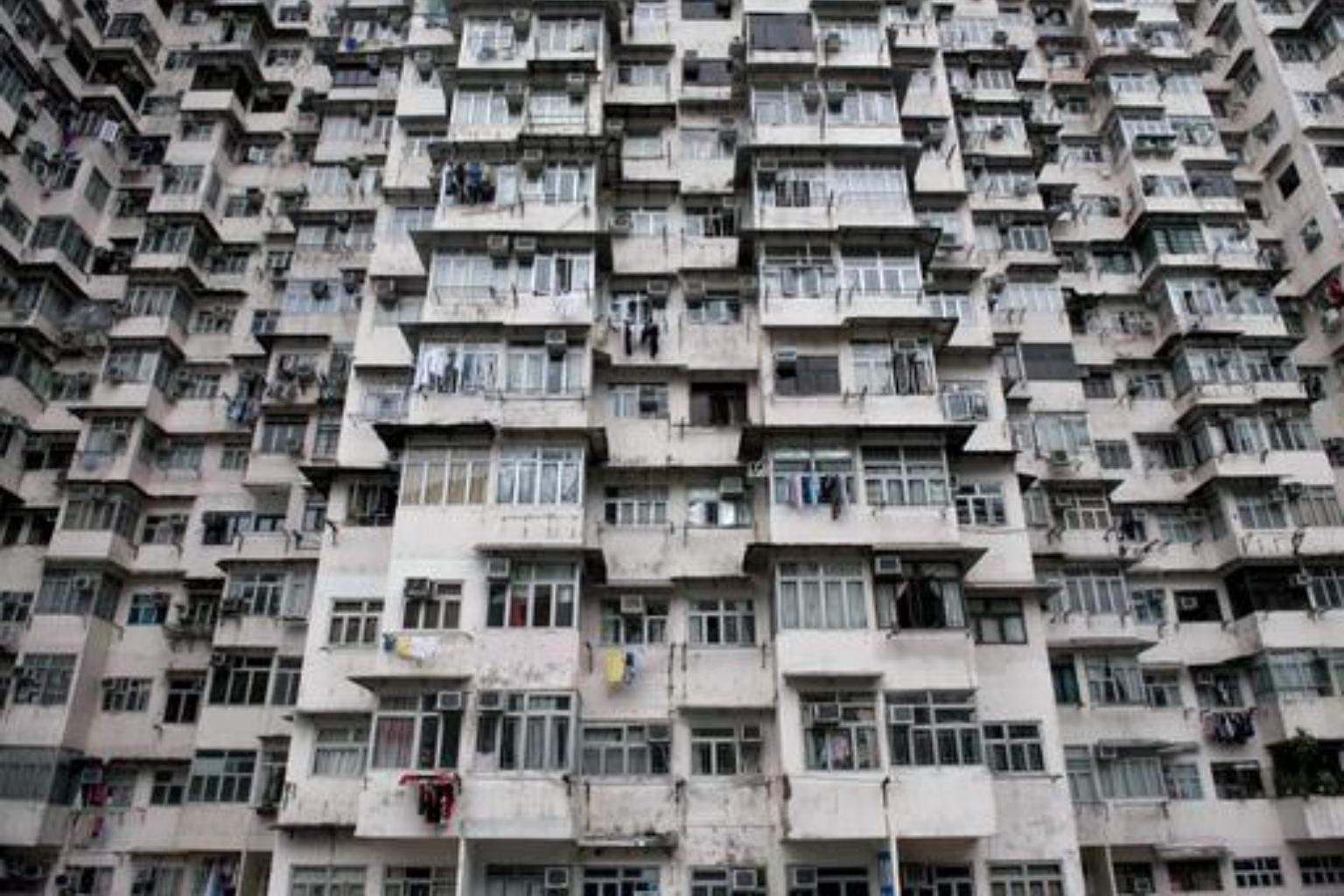 Residential units are seen clustered tightly together in an apartment complex in the Quarry Bay area of Hong Kong.
