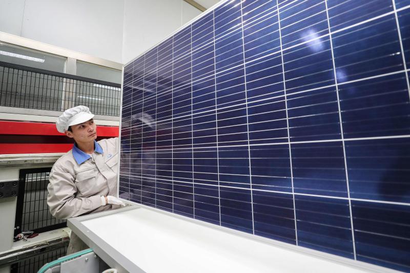A worker checks newly made solar panels at a factory in Lianyungang in Jiangsu, China.