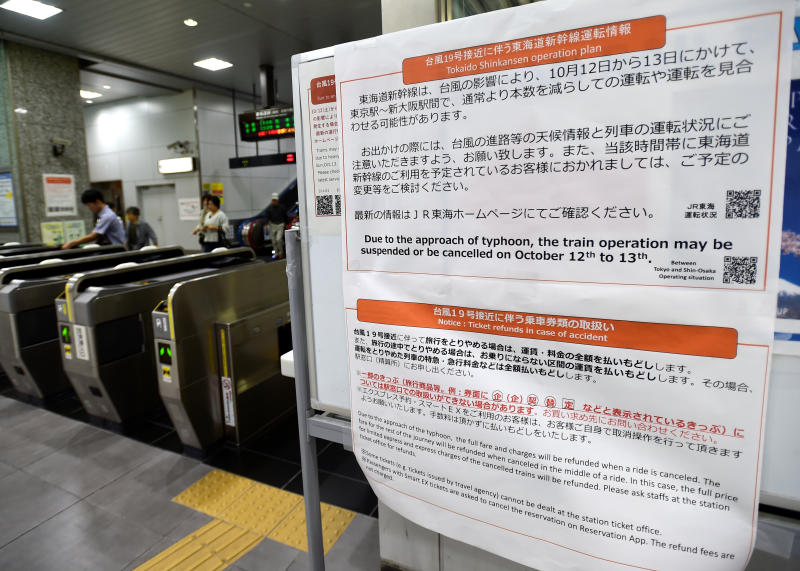 A travel warning sign regarding Typhoon Hagibis and possible train suspensions or cancellations at Hamamatsu railway station on Oct 10, 2019.