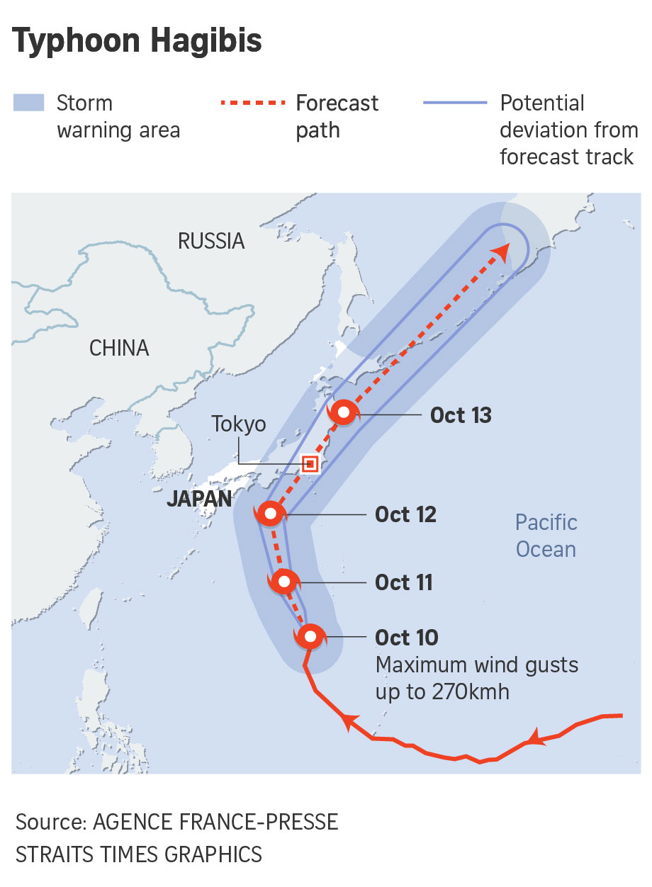 Typhoon Hagibis - the 19th of the season - already brought rain to Tokyo on Thursday night (Oct 10). The size of the storm prompted the Japan Meteorological Agency (JMA) to take the rare move of issuing a weather warning on Wednesday, three days before it was set to make landfall.