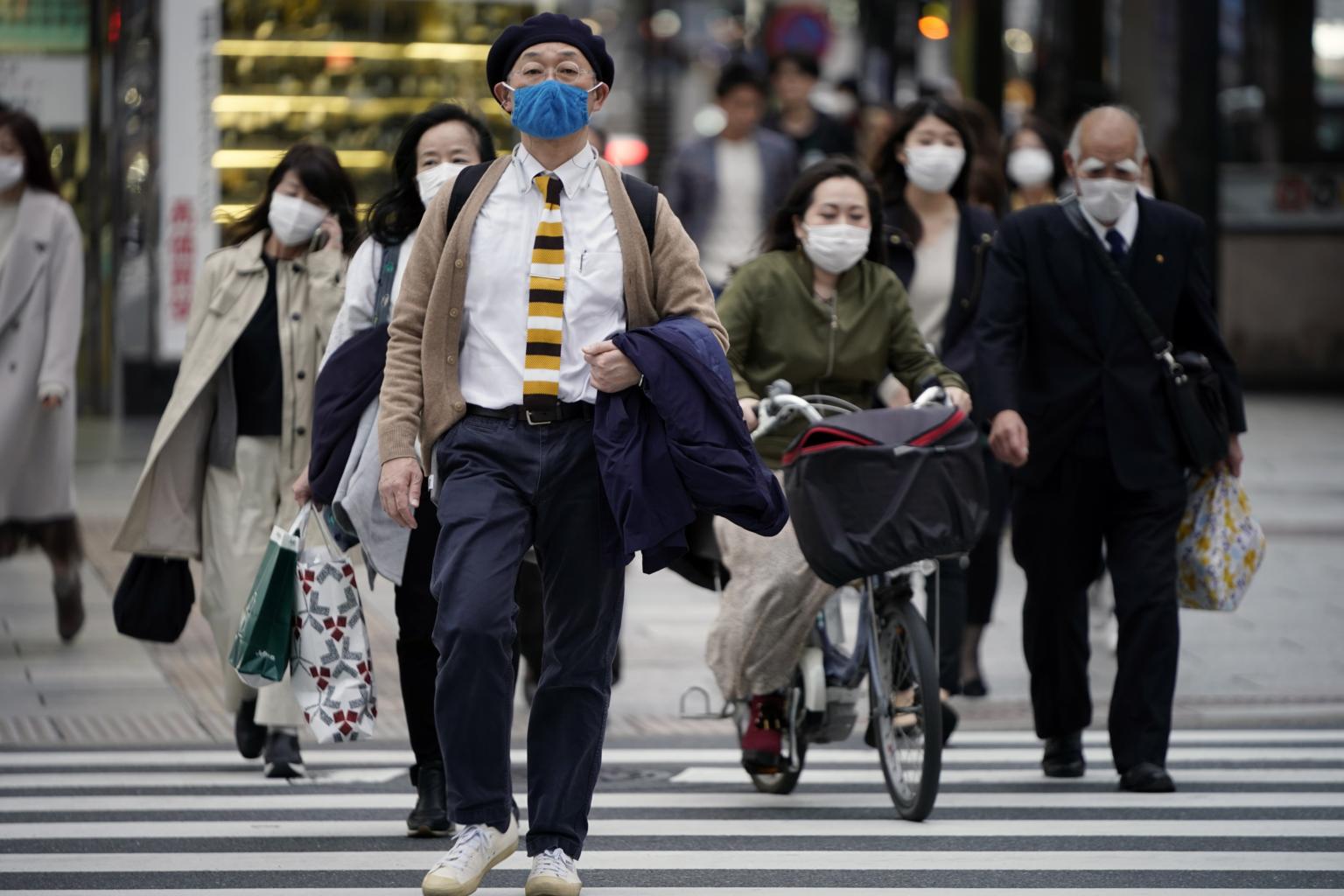 Pedestrians wearing masks walk in Ginza shopping district in Tokyo, Japan, on March 27, 2020.