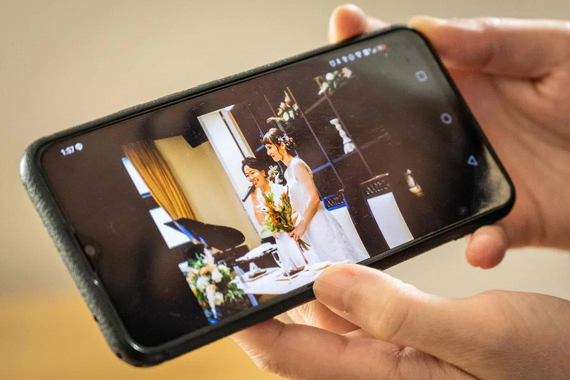 Miki showing a picture of her wedding with her partner Katie at their home in Tokyo.