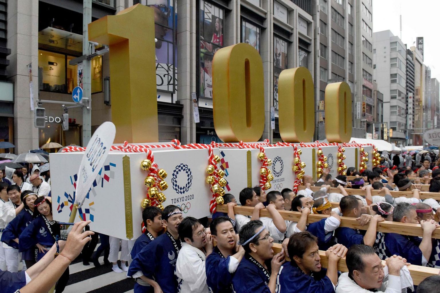 Participants carry floats to celebrate 1000 days to go until the opening ceremony of the 2020 Olympic Games in Tokyo on Oct 28, 2017.