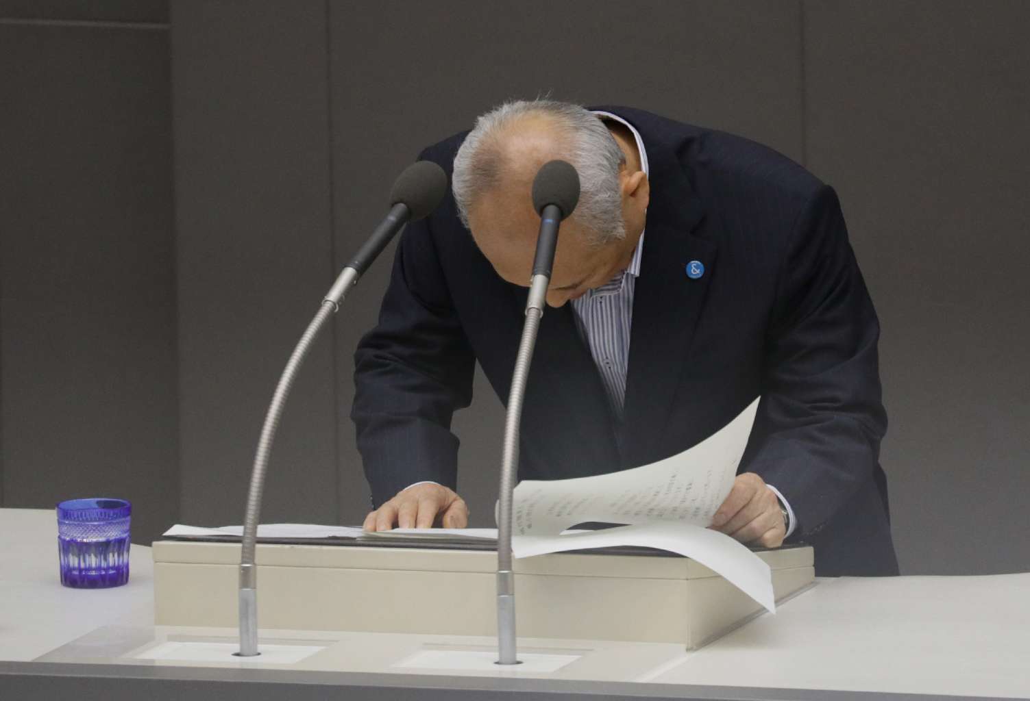 Tokyo governor Yoichi Masuzoe bows at the Tokyo metropolitan assembly, on June 1, 2016.