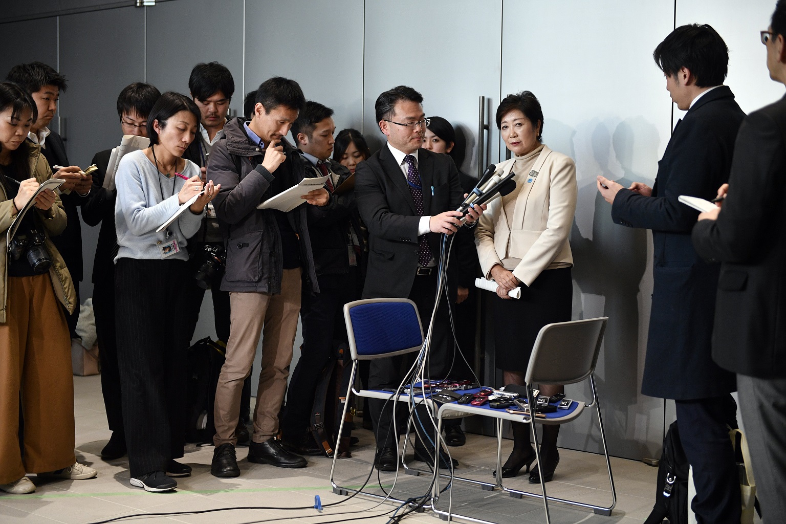 Tokyo Governor Yuriko Koike answers questions from reporters after a media tour at the new Toyosu Wholesale Market in Tokyo, on Feb 13, 2018.