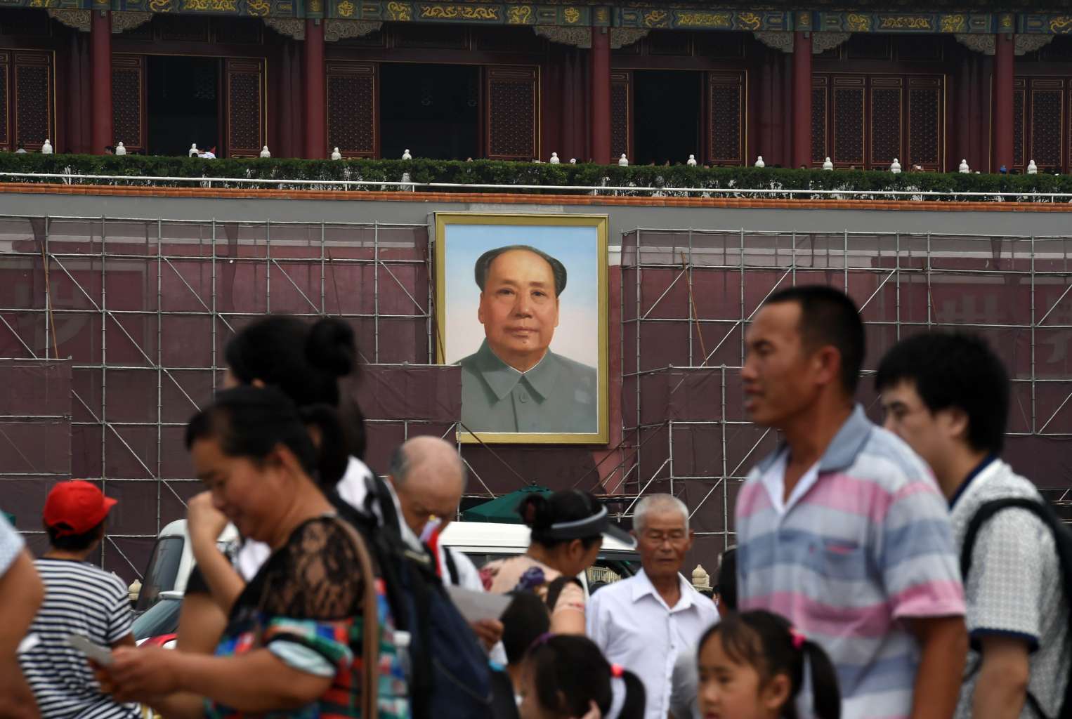 Tourists walking in Tiananmen Square in front of scaffolding next to the portrait of late communist leader Mao Zedong in Beijing.