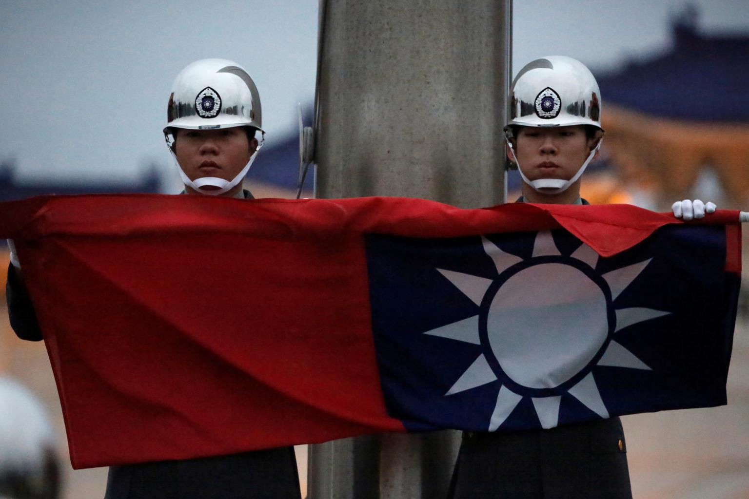 Honour guards perform the Taiwan national flag lowering ceremony at Liberty Square in Taipei, on April 1, 2020.