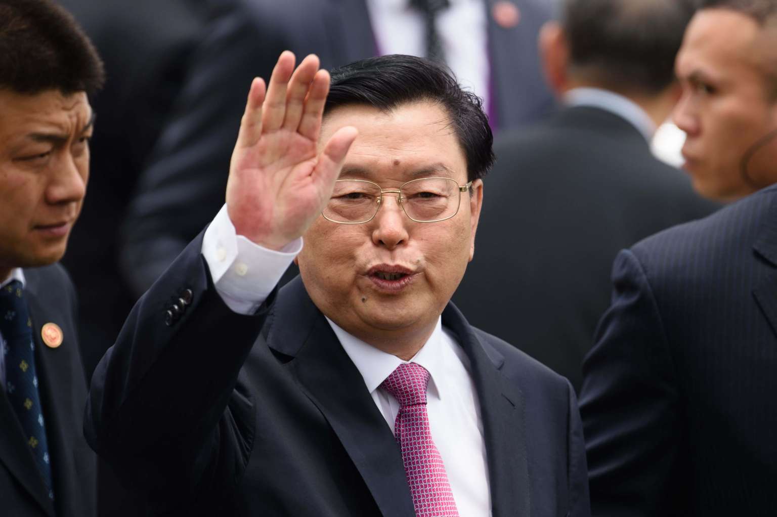 National People's Congress Standing Committee Chairman Zhang Dejiang waves as he walks towards his car at the international airport in Macau on May 8, 2017.