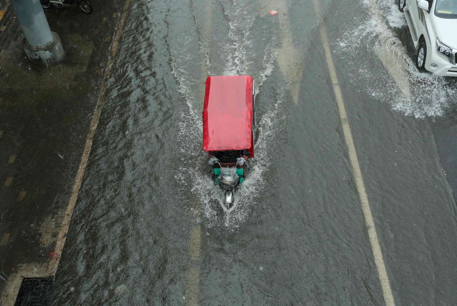 A tricycle makes its way along a flooded street in Beijing on July 20, 2016.