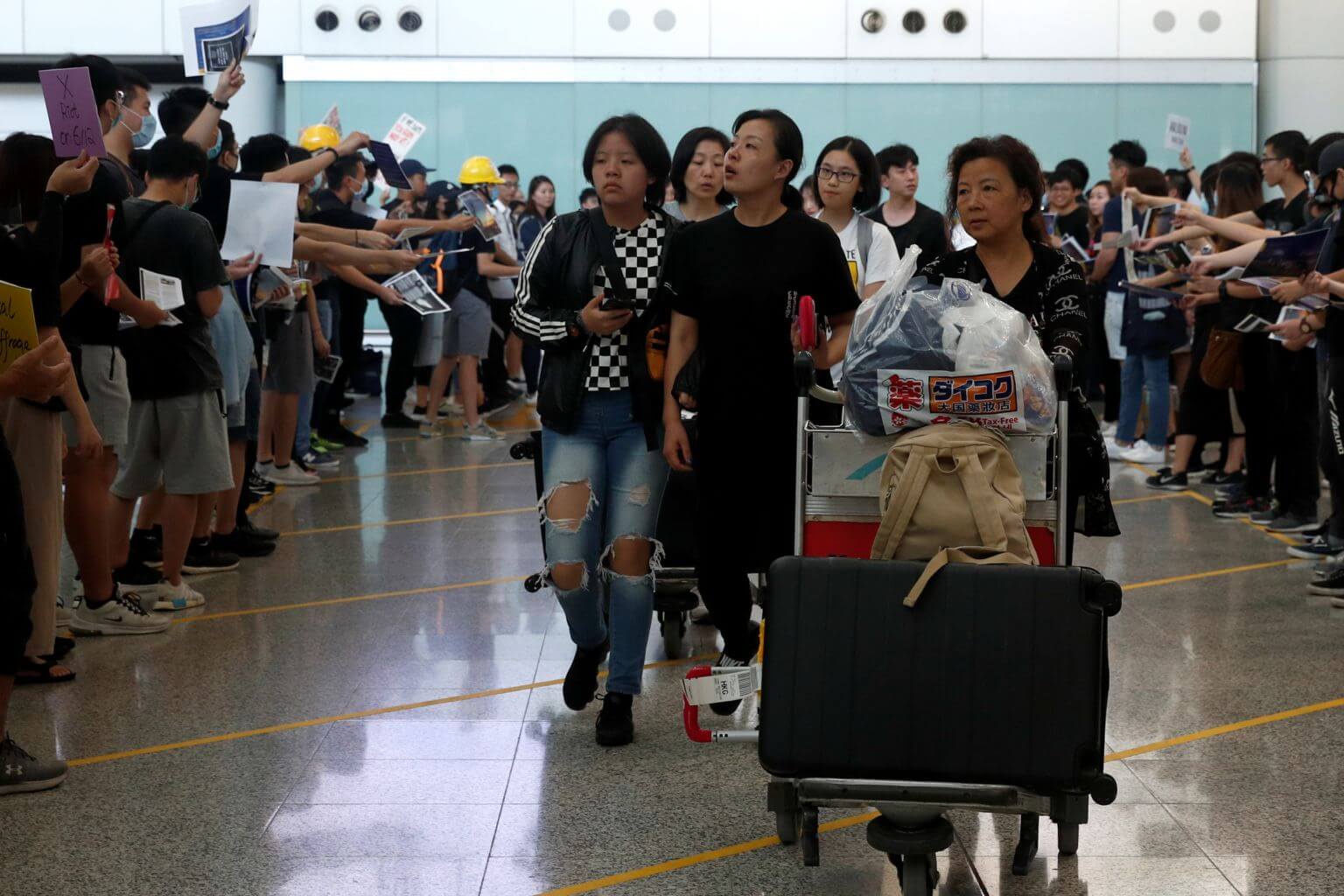 In this photo taken on July 26, 2019, demonstrators offer leaflets to arriving tourists during a protest at Hong Kong airport. Paranoid they could be targeted and wary after seeing footage of the protests, many Chinese tourists are staying away from the city.
