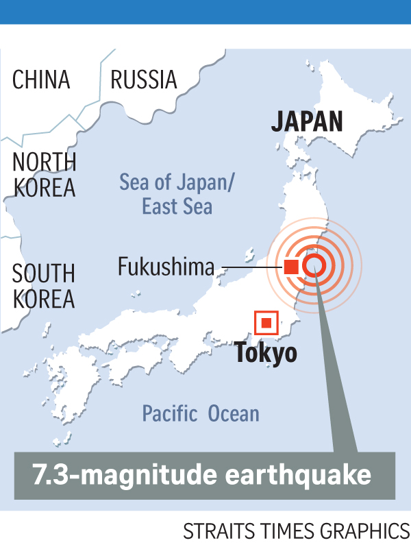The 7.3-magnitude quake had struck at 11.08pm local time (10.08pm Singapore time) on Saturday and cracked walls, shattered windows and set off a landslide in Fukushima, the area closest to the epicentre.