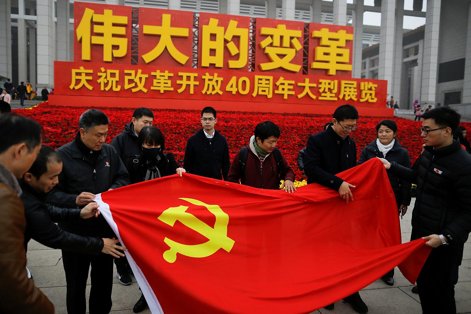 Visitors unfold the flag of the Chinese Communist Party outside an exhibition marking the 40th anniversary of China's reform and opening up at the National Museum of China in Beijing, China, on Nov 14, 2018.