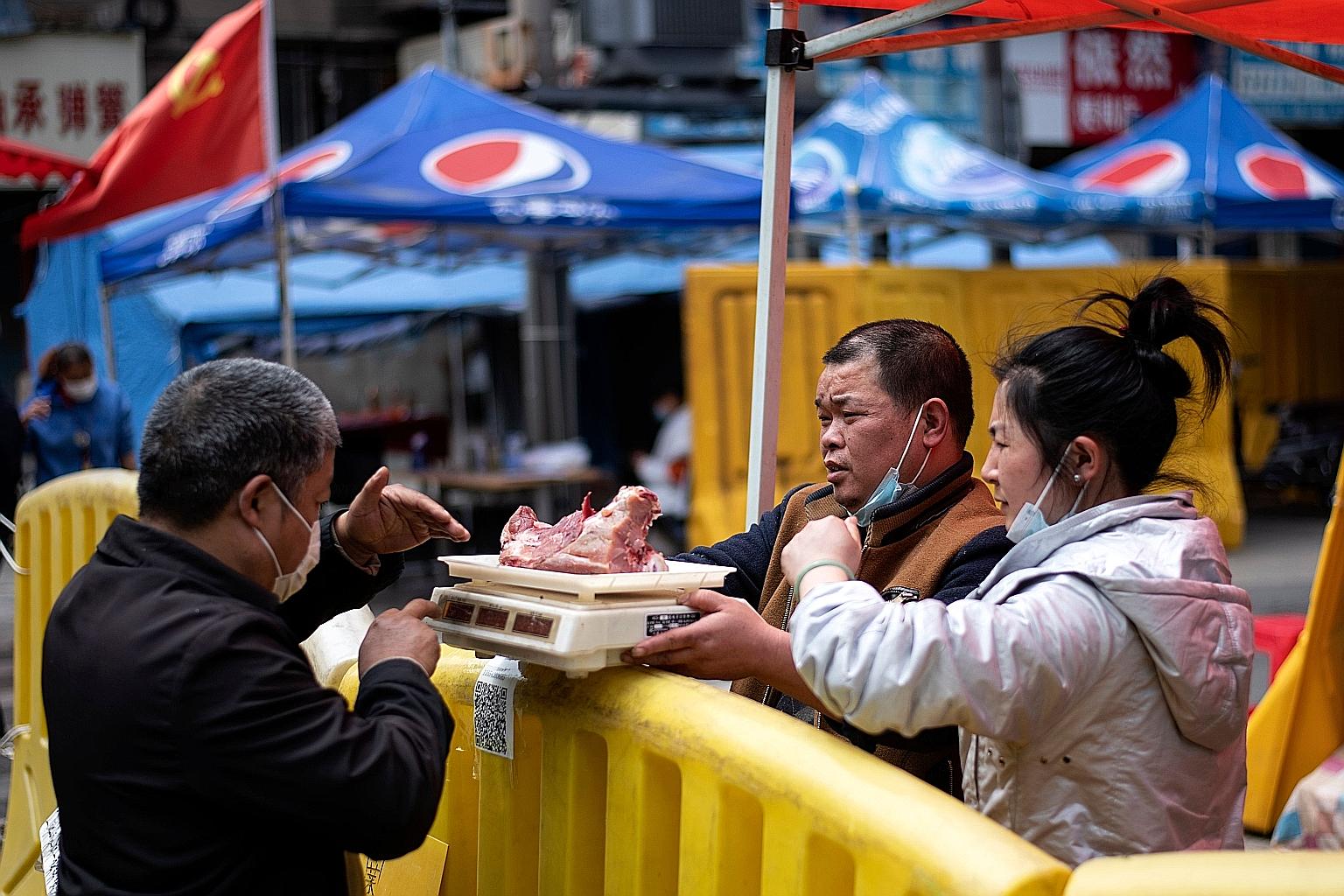 A man (left) buying meat from a vendor on the other side of a barricaded residential compound in Wuhan on Tuesday. Some estates are regulating residents’ movements.