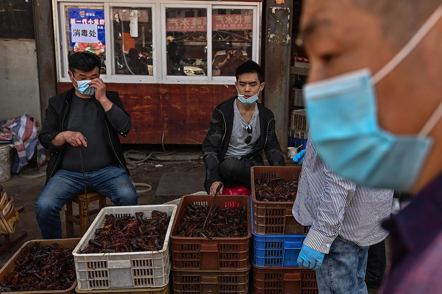 Vendors offering prawns for sale at the Wuhan Baishazhou market on Wednesday. Small and medium-sized retail businesses are the hardest hit in the city.