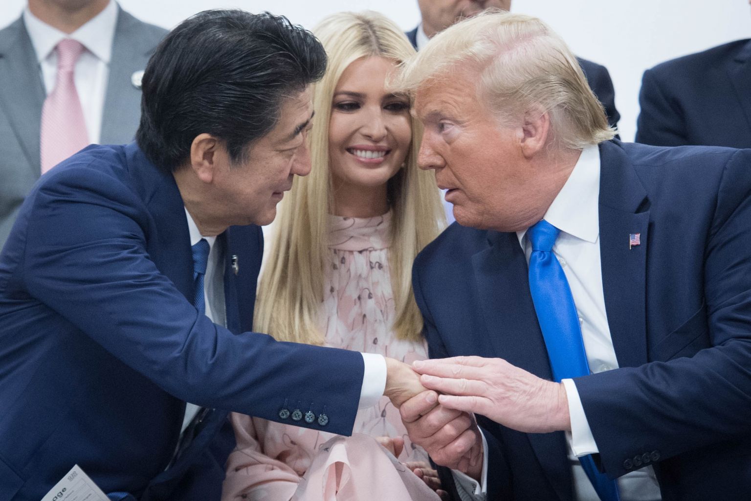 Trump (right) shakes hands with Japanese Prime Minister Shinzo Abe as Ivanka Trump looks on.