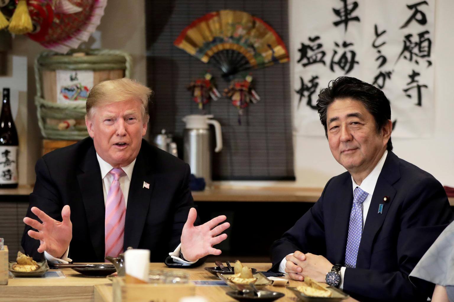 US President Donald Trump talks with Japanese Prime Minister Shinzo Abe during a couples dinner with first lady Melania Trump and Abe's wife Akie in Tokyo, Japan, on May 26, 2019.