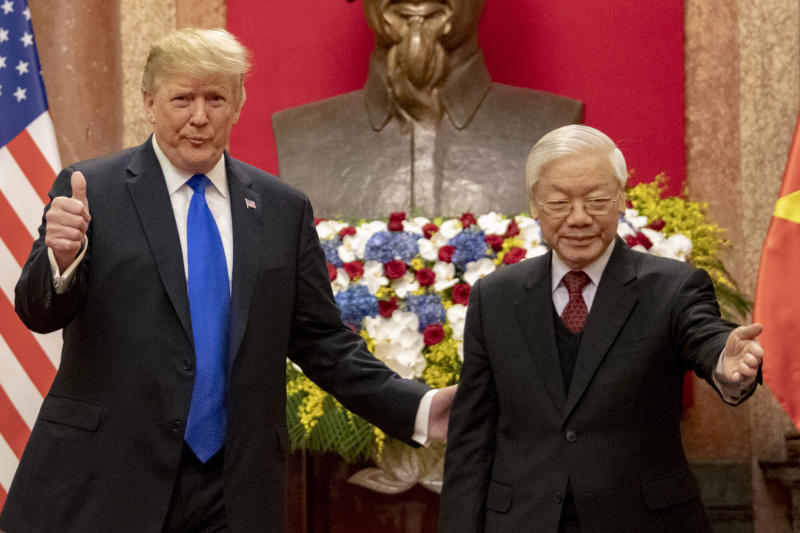 Vietnamese President Nguyen Phu Trong meets US President Donald Trump in Hanoi on Feb 27, 2019.