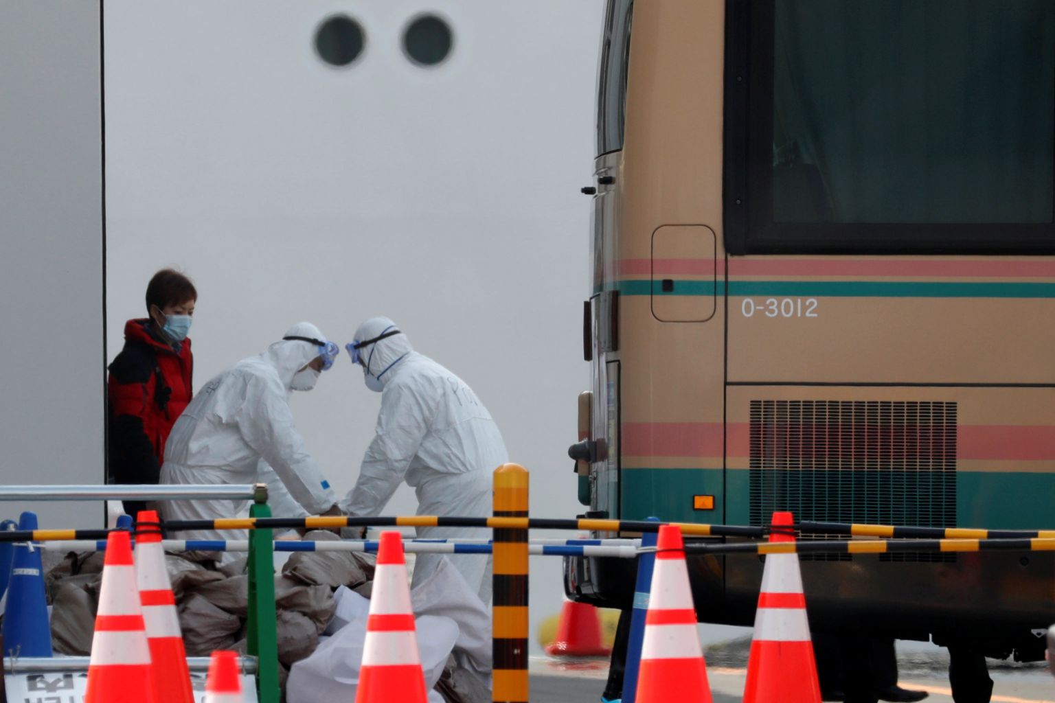Workers in protective gear help to load disembarking passengers luggage onto a bus after leaving the Diamond Princess cruise ship docked at Yokohama Port, south of Tokyo, Japan, on Feb 20, 2020.