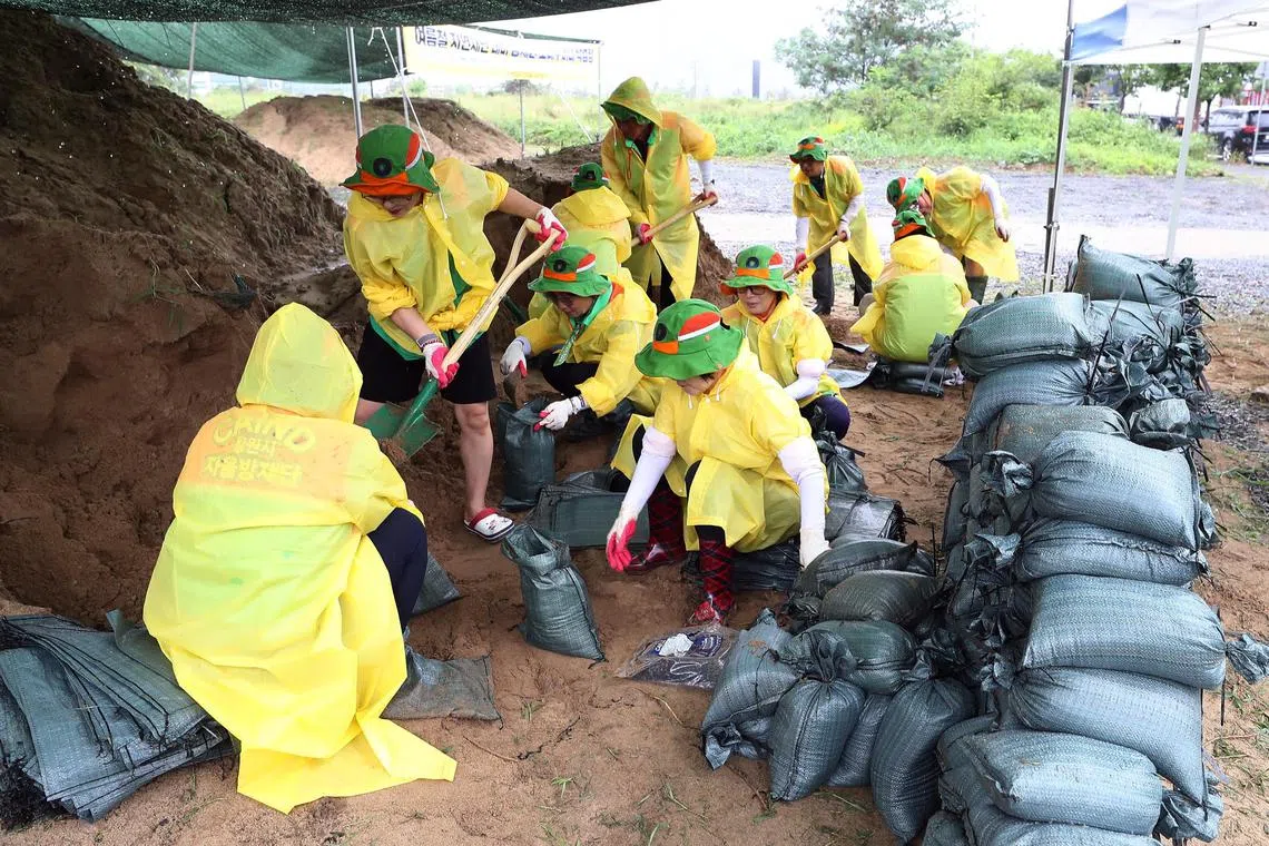 Volunteers fill sacks with sand to keep coastal roads from being flooded in Changwon, South Gyeongsang province, on Aug 9.