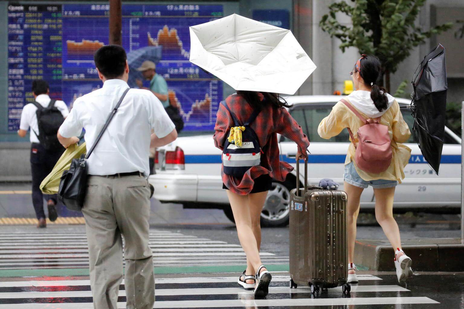 People using umbrellas struggle against a heavy rain and wind in front as Typhoon Shanshan approaches Japan's mainland in Tokyo, Japan, on Aug 8, 2018.