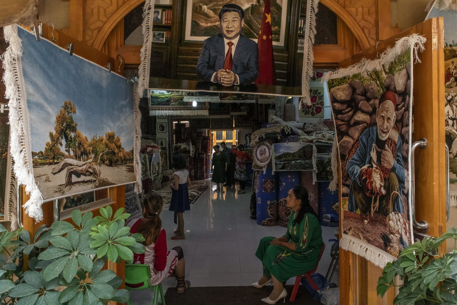 A 2019 photo shows an image of Chinese President Xi Jinping at a carpet store in Hotan, a town in Xinjiang, in China’s west.