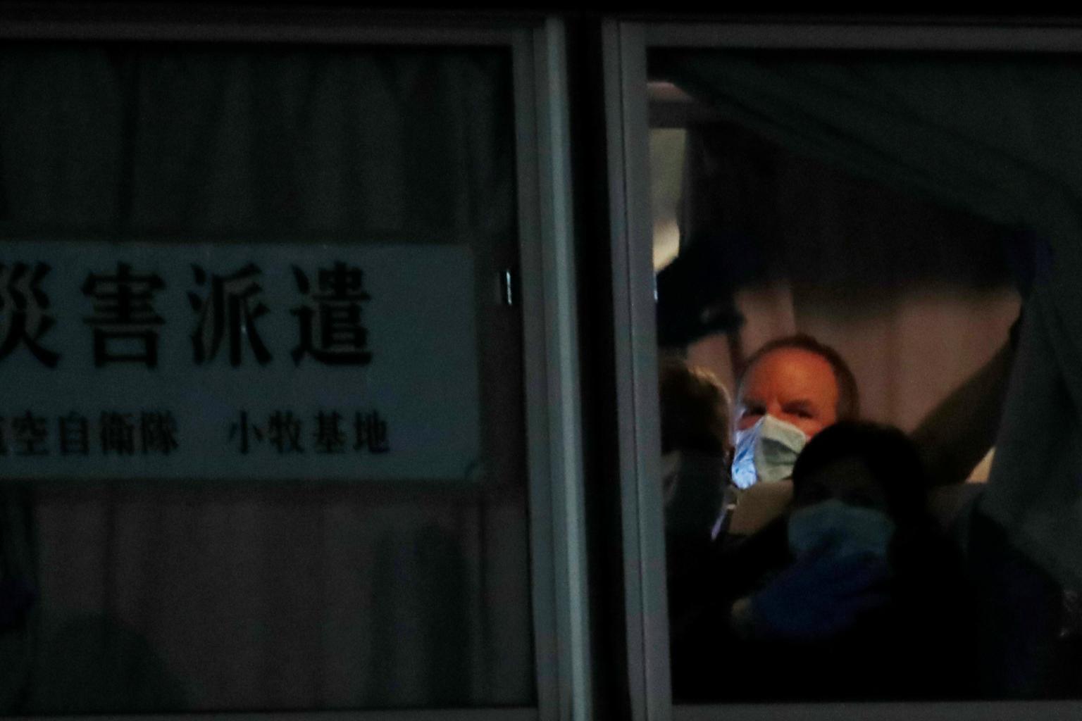 British passengers wave from the window of a bus after they left the coronavirus-hit cruise ship Diamond Princess at the Daikoku Pier Cruise Terminal in Yokohama, south of Tokyo, Japan, on Feb 22, 2020.
