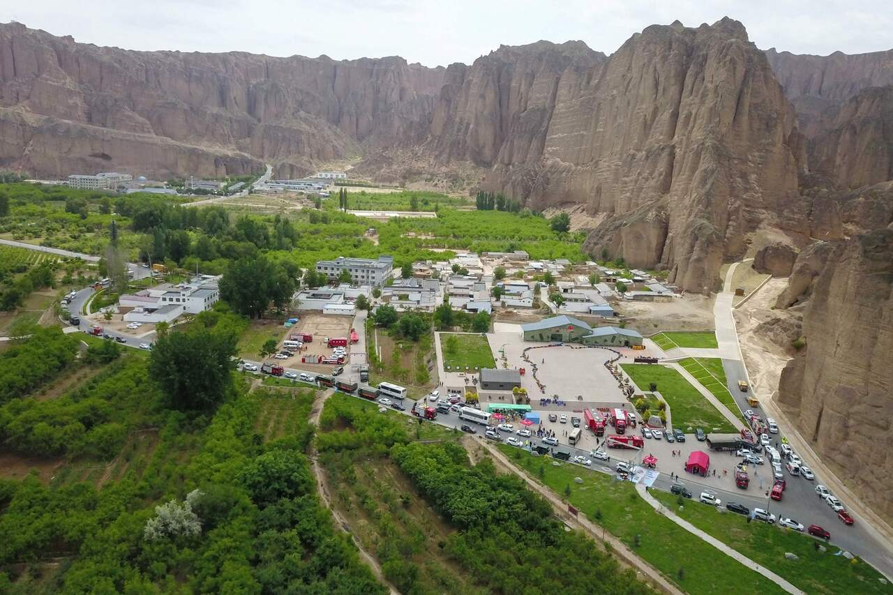 A photo taken on May 23 shows rescue vehicles preparing to leave after finishing a search for participants of the ultramarathon.