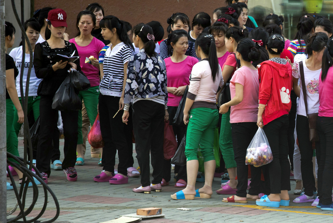 In a photo from Sept 2, 2017, North Korean workers from the Hong Chao Zhi Yi garment factory gather at a street market in the city of Hunchun in north-eastern China's Jilin province.