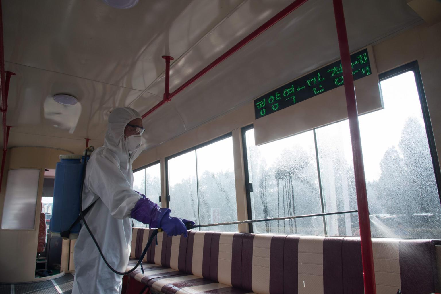 An official from the Mangyongdae District emergency anti-epidemic headquarters disinfects a tramcar to prevent the spread of the coronavirus at the Songsan Tram Station in Pyongyang on Feb 26, 2020.