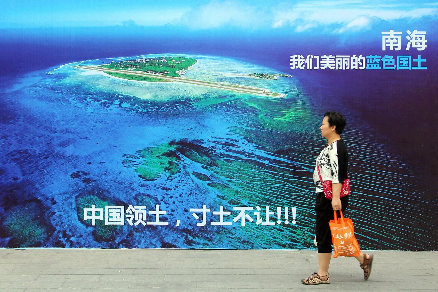 A woman walking past a poster of the South China Sea in Weifang, east China's Shandong province.