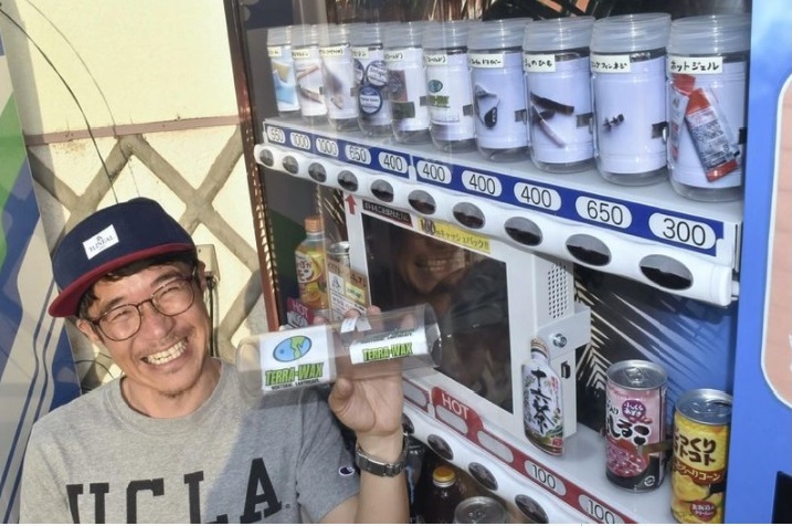 Mr Yuichi Ikeda holding a container of surfboard wax sold at his vending machine in Miyazaki Prefecture. It is literally a lifesaver for surfers who have forgotten important items.