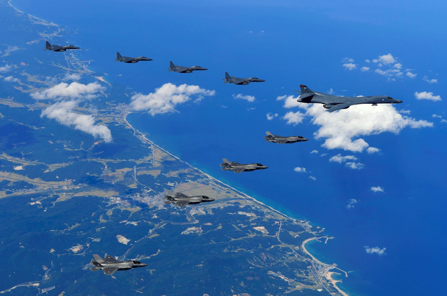 A Sept 18, 2017, photo shows a US Air Force B-1B Lancer bomber (right) and fighter jets flying over South Korea during a joint military drill.