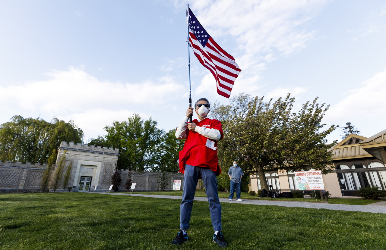 A man holds an American flag in New York, on May 12, May 2020.