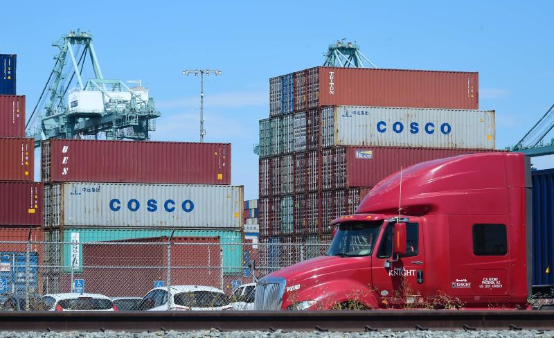 A container delivery truck passes containers stacked at the Port of Long Beach in Long Beach, California, on July 6, 2018.