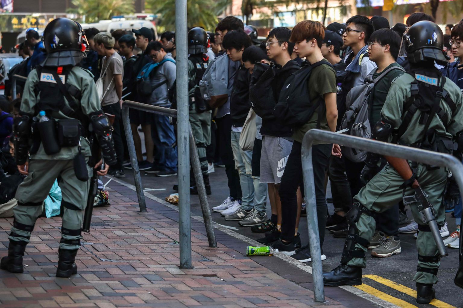 People are detained by police near the Hong Kong Polytechnic University in Hong Kong on Nov 18, 2019.