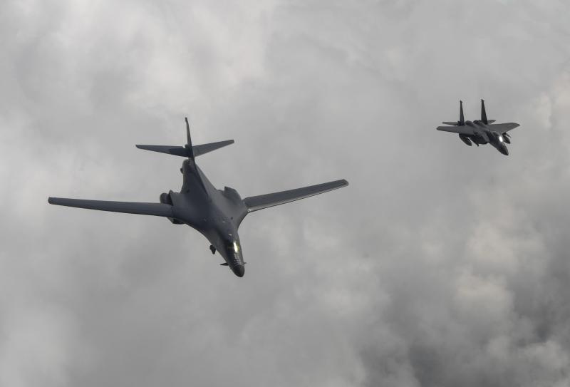 An American B1-B bomber (left) escorted by a South Korean F-15K fighter (right) fly over South Korea into Japanese airspace and over the Korean Peninsula on July 30, 2017