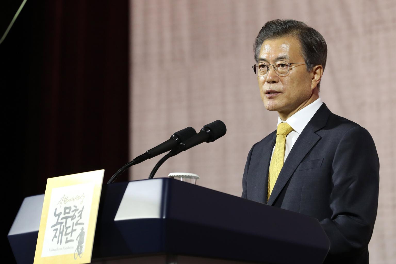 South Korean President Moon Jae In makes a speech at the 10th anniversary of an inter-Korean summit in Seoul, South Korea, on Sept 26, 2017.