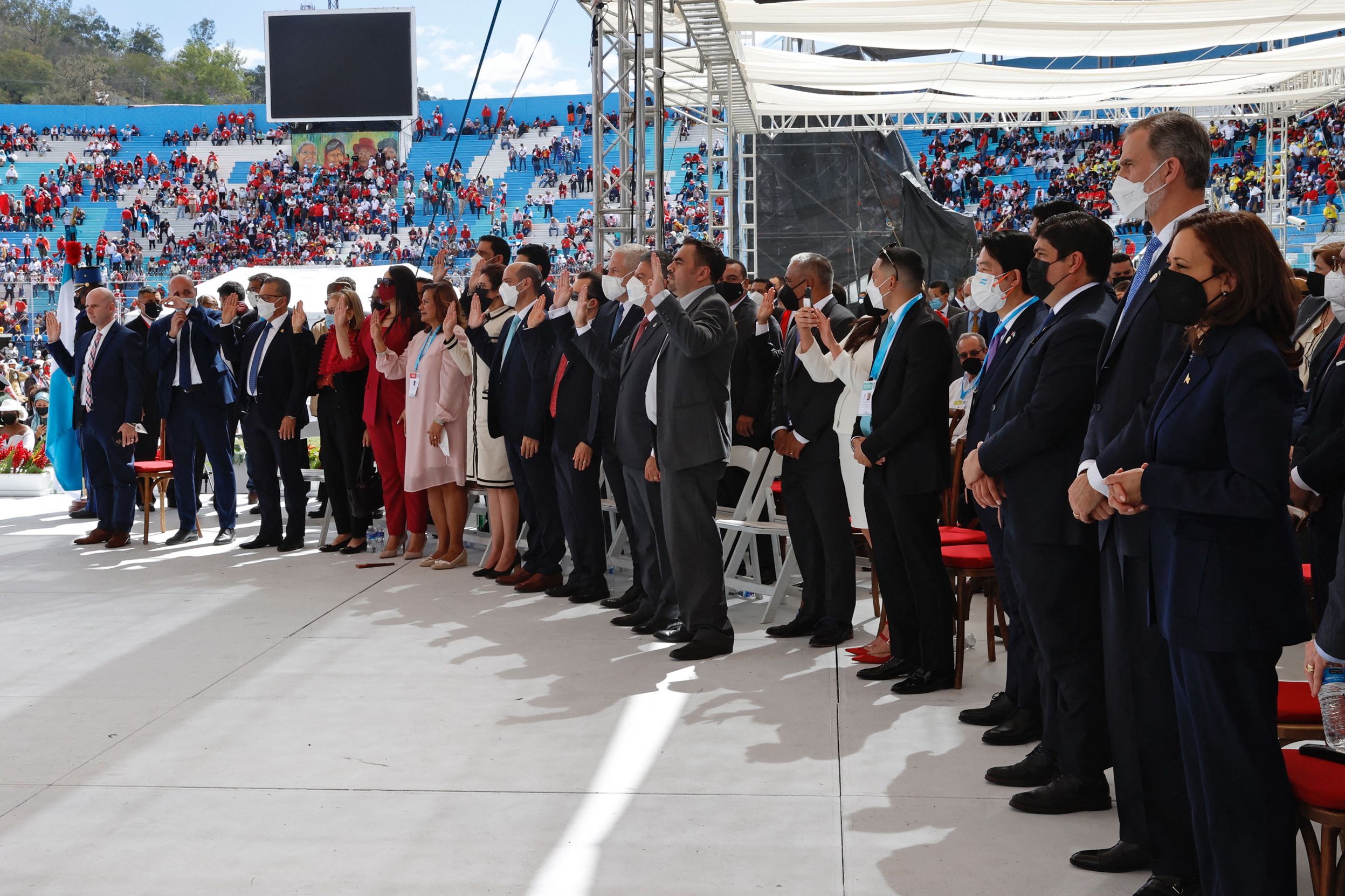 (From right) US Vice-President Kamala Harris, Spanish King Felipe VI, Costa Rican President Carlos Alvarado and Taiwanese Vice President William Lai attend the inauguration ceremony.