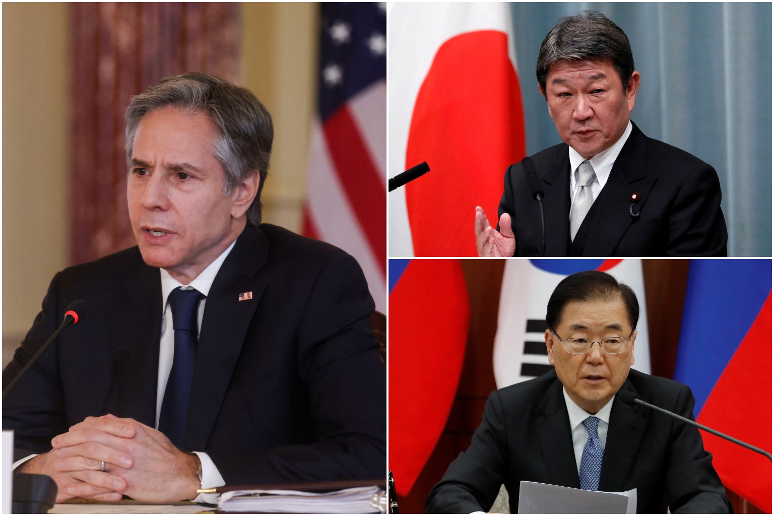 (Clockwise from left) Mr Antony Blinken, Mr Toshimitsu Motegi and Mr Chung Eui-yong are expected to affirm their cooperation on dealing with North Korea's nuclear and missile development.