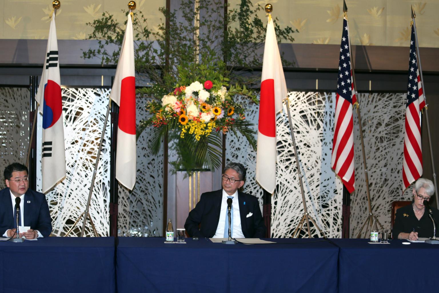 Japanese vice-foreign minister Takeo Mori, US Deputy Secretary of State Wendy Sherman and South Korea's vice-foreign minister Choi Jung-kun in Tokyo, on July 21.