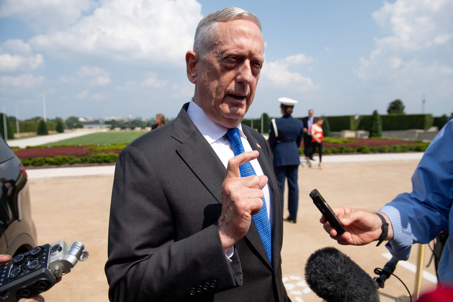 Jim Mattis speakong to the press outside the Pentagon in Washington, Aug 28, 2018,