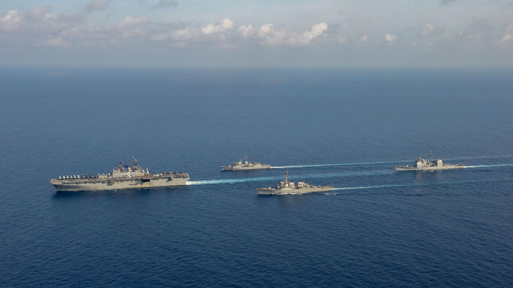 The USS Barry (third from left) joins other ships in officer of the watch manoeuvres in the South China Sea, on April 18, 2020.